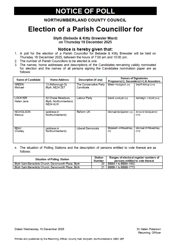 Notice of poll and situation of polling station for the election of a parish councillor for Bebside and Kitty Brewster ward