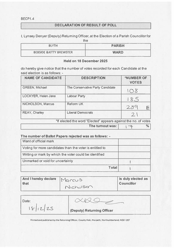 Congratulations to Marcus, we look forward to welcoming you as the newest elected member of Blyth Town Council.