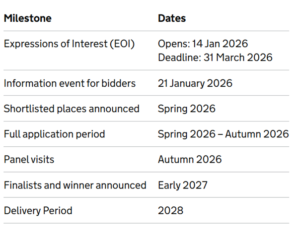 The first stage is shortlisting, expected to be announced this spring, with shortlisted towns receiving funding to further develop their bids before a final decision is made later in the year.